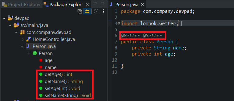 이제 롬북을 사용해보자. 아래와 같이 @Getter @Setter를 입력하면 getter, setter가 자동으로 생성된다.