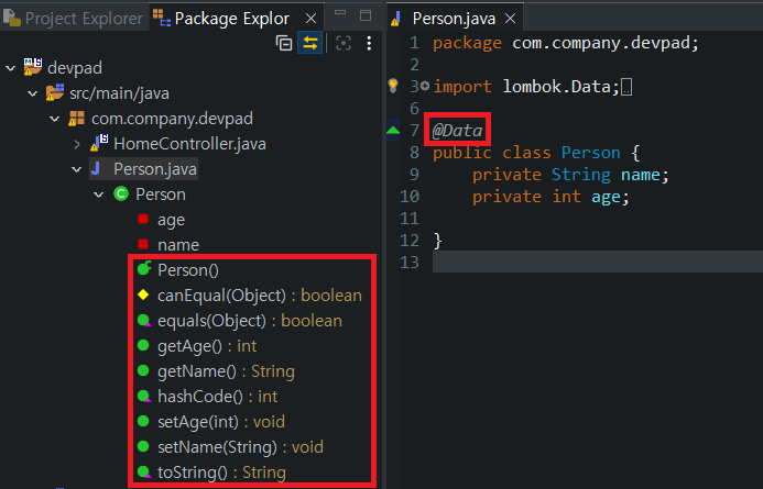 이번에는 @Data를 사용해보자. 해당 어노테이션은 많은 것들을 한꺼번에 설정해주는 끝판왕이라고 보면 된다. (@Getter, @Setter, @RequiredArgsConstructor, @ToString, @EqualsAndHashCode을 한꺼번에 설정해준다)