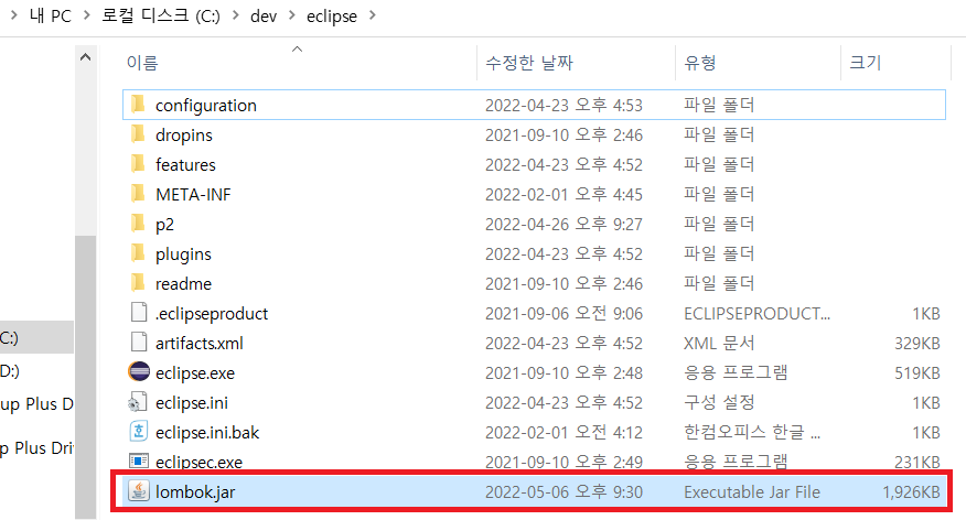 파일의 다운로드가 완료되었으면, 이클립스 또는 STS가 설치된 경로에 lombok.jar를 붙여넣은 후 해당 파일을 실행한다.