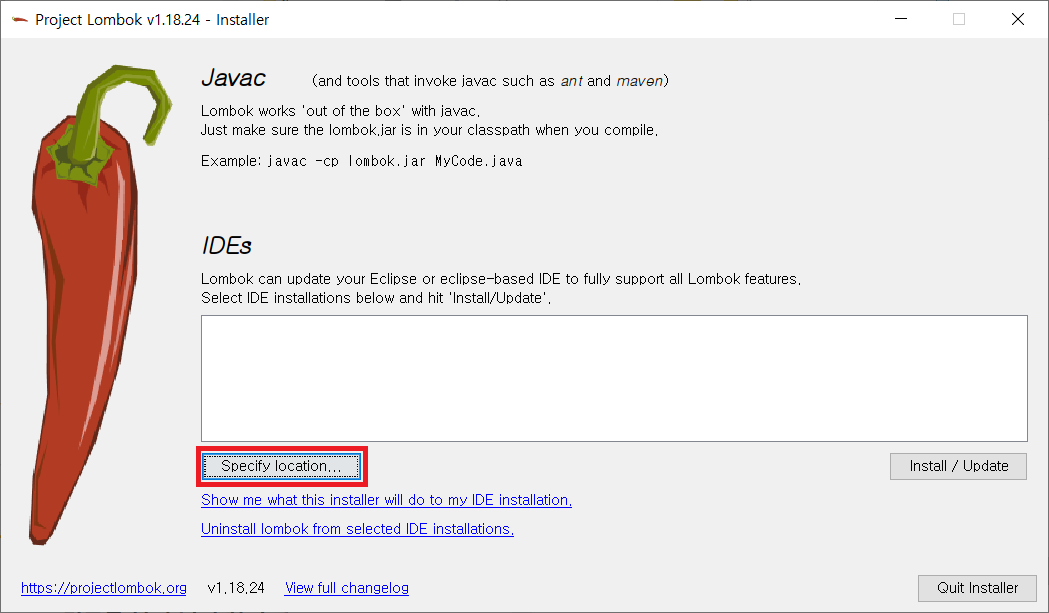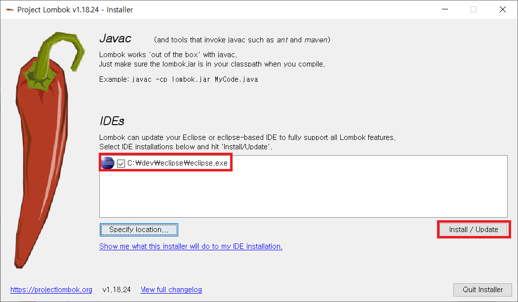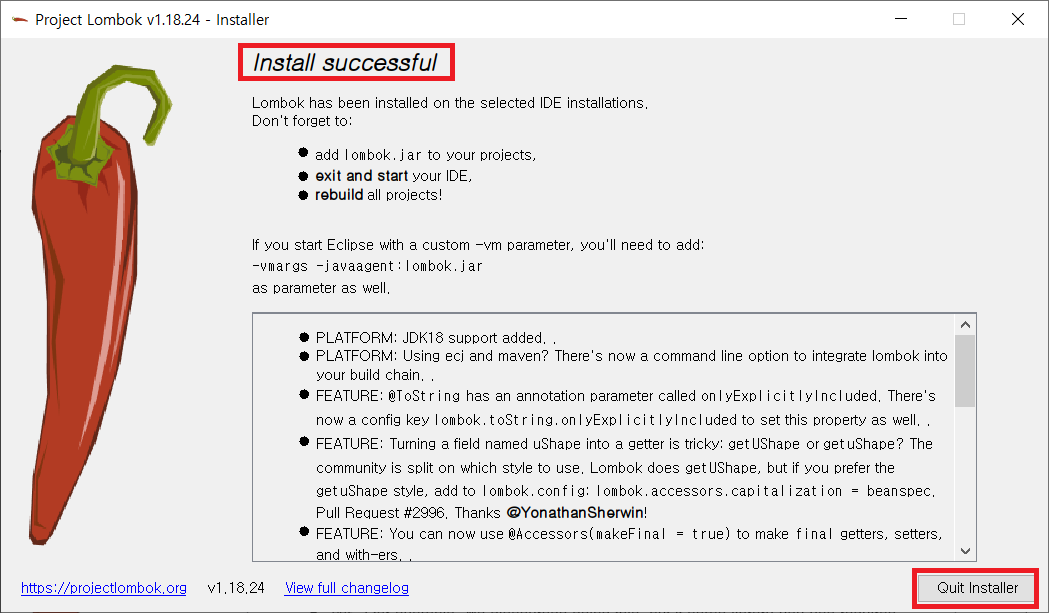 롬북이 바로 설치된다. 설치 성공했다는 메세지가 뜬다면 [Quit Installer]를 눌러 창을 닫는다. 만약 설치 여부를 확인하고 싶다면 이클립스의 eclipse.ini 파일을 열어 -javaagent:C:\dev\eclipse\lombok.jar 와 같은 명령어가 추가되어 있으면 된다.
