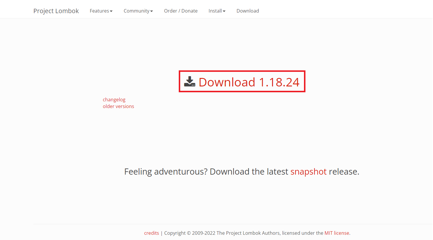 Lombok 사이트에 들어가서 jar 파일을 직접 설치하자. 2022년 5월 기준으로 최신 버전은 1.18.24이다.
