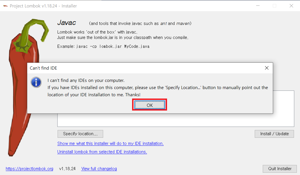 그러면 인스톨러 창이 실행이 될 것이다. 아래와 같이 내 PC에서 IDE를 찾을 수 없다는 경고창이 나오더라도 OK를 눌러 닫으면 된다.