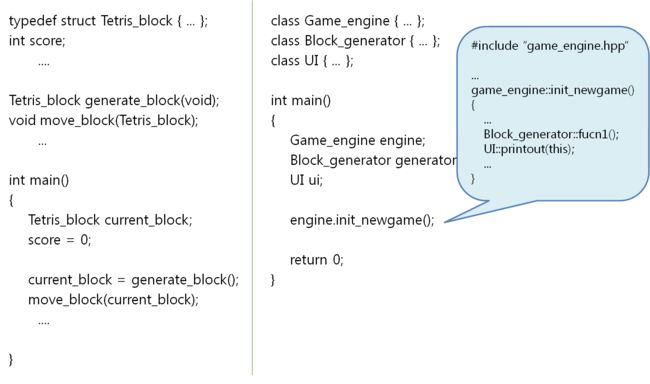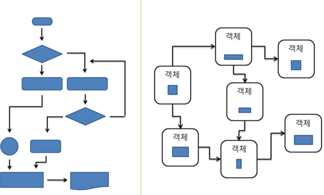 - 절차지향은 변수 따로 함수 따로의 분산적이고 통일성이 없지만, 객체지향은 좀 더 모듈화되어 체계적이다.
