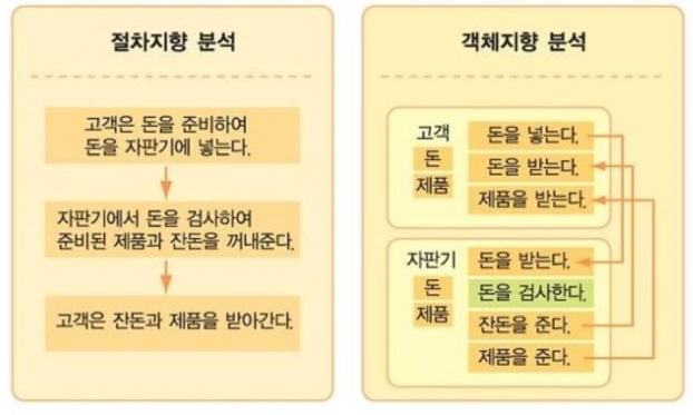 - 절차지향은 과도한 전역변수의 사용, 스파게티 소스, 변경과 확장이 어렵지만, 객체지향은 코드의 재사용성이 높다.