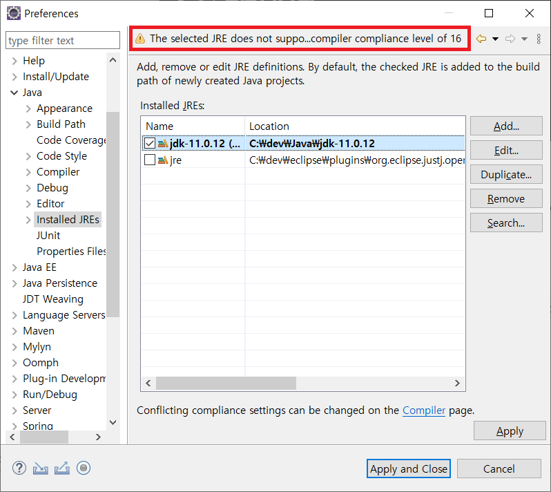 그럼 방금 등록한 JDK가 새로 뜨는데, 이를 선택하고 'Apply'를 누른다. 만약 이때 상단에 아래와 같은 오류 문구가 나온다면 포스팅을 참고하자.
