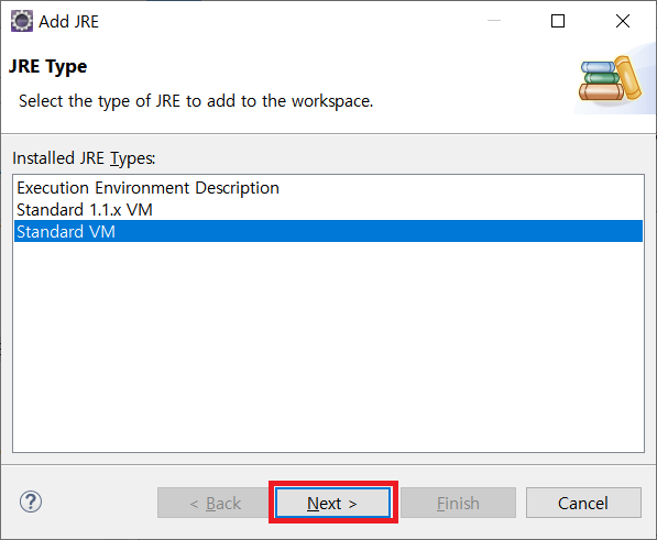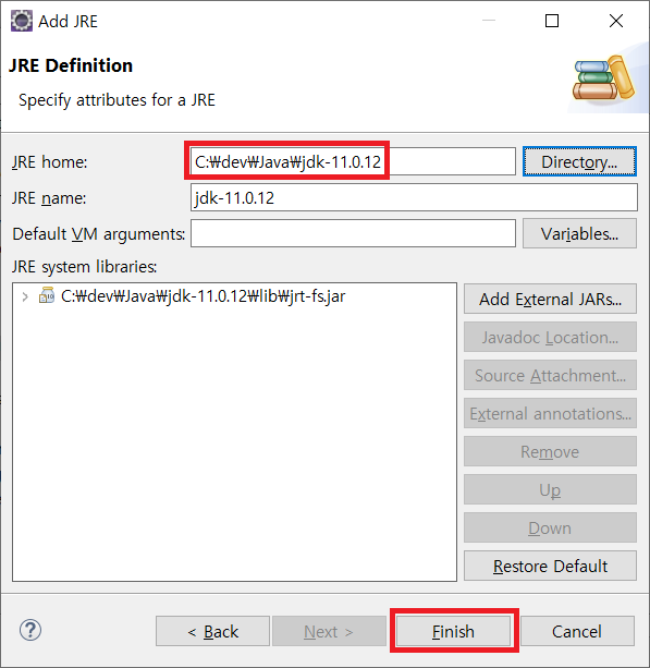 이제 설치한 JDK의 경로를 잡아준 뒤 'Finish' 버튼을 누른다.