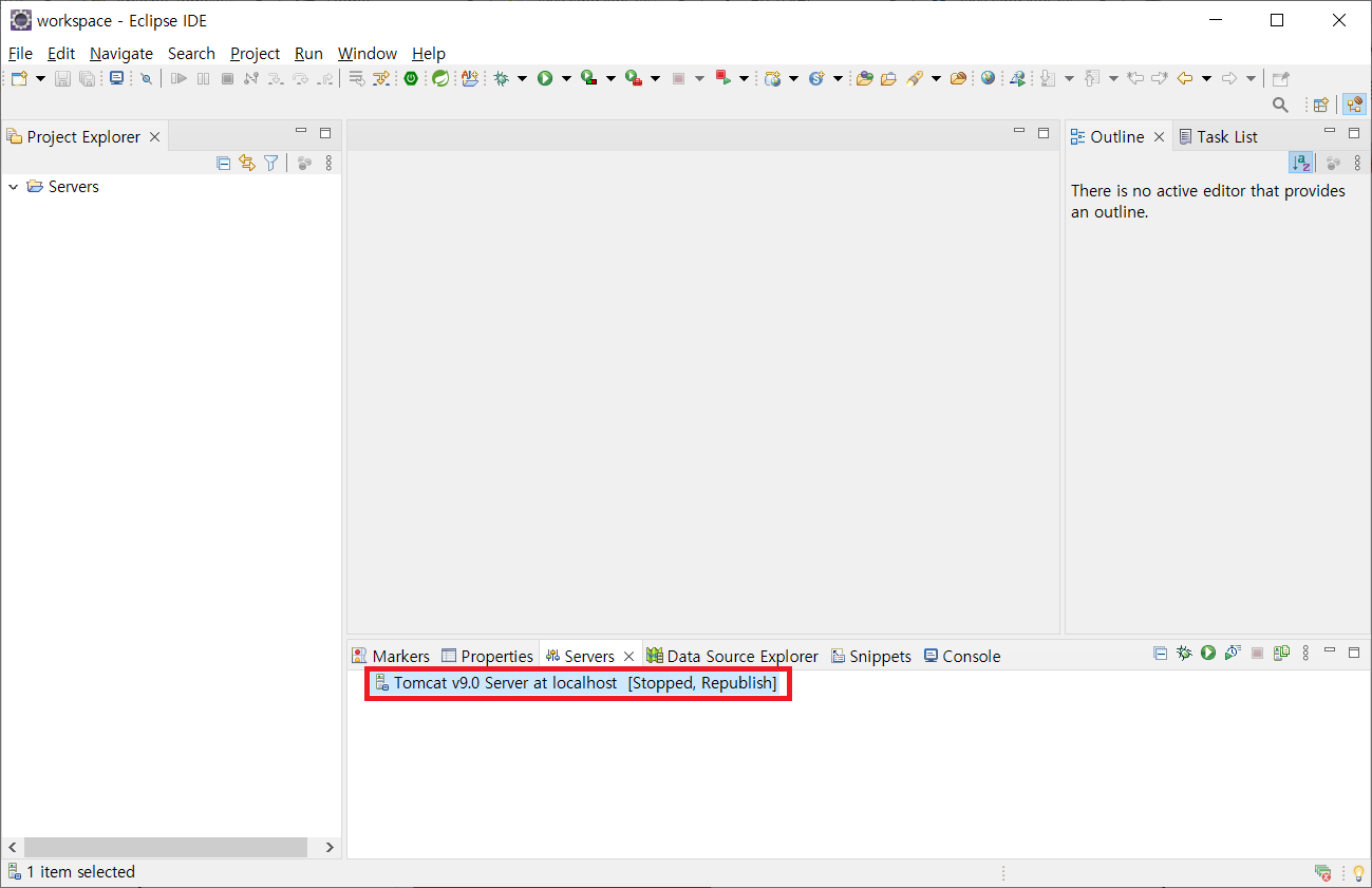 이제 이클립스 하단의 Servers 탭에서 톰캣 서버가 추가된 것을 확인할 수 있다. 아직 실행하지 않았기 때문에 Stopped 된 상태이다.