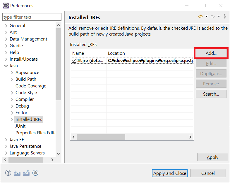 이제 톰캣이 설치가 잘 되었는지 테스트를 해보자. 이클립스 상단 메뉴에서 [Window] - [Preferences] - [Java] - [Installed JREs]에 들어가서 'Add' 버튼을 누른다.