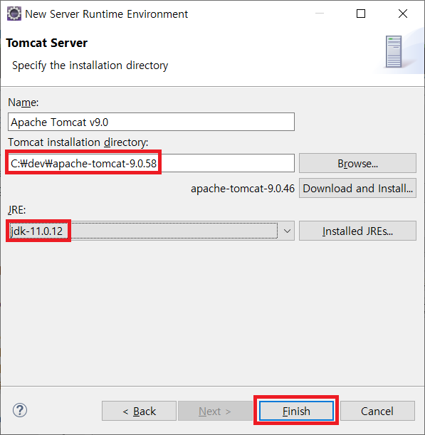 톰캣을 설치했던 디렉터리를 입력하고, 디폴트 실행환경을 JDK로 변경한 뒤 'Finish' 버튼을 누른다.