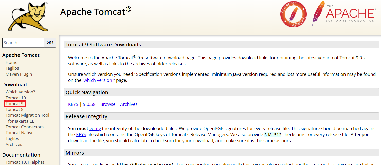 Apache Tomcat 사이트에 접속해서 Tomcat 9를 설치하려고 한다. Apache Tomcat Release 버전을 보면 2021년 1월 기준으로 10 버전까지 나와있다.