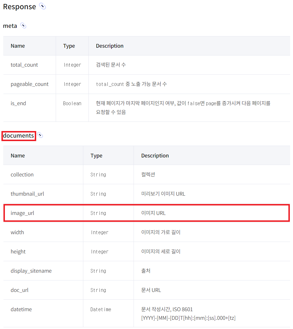 이미지 검색 응답시(response), 응답 결과 데이터에서 documents > image_url 항목이 추출하고자 하는 이미지 URL이다. 즉, image_url 항목이 추출할 목표 대상이다.