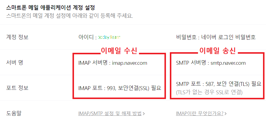 - 이메일 수신시, IMAP 프로토콜을 사용하며 서버명은 imap.naver.com, 포트는 993이다.