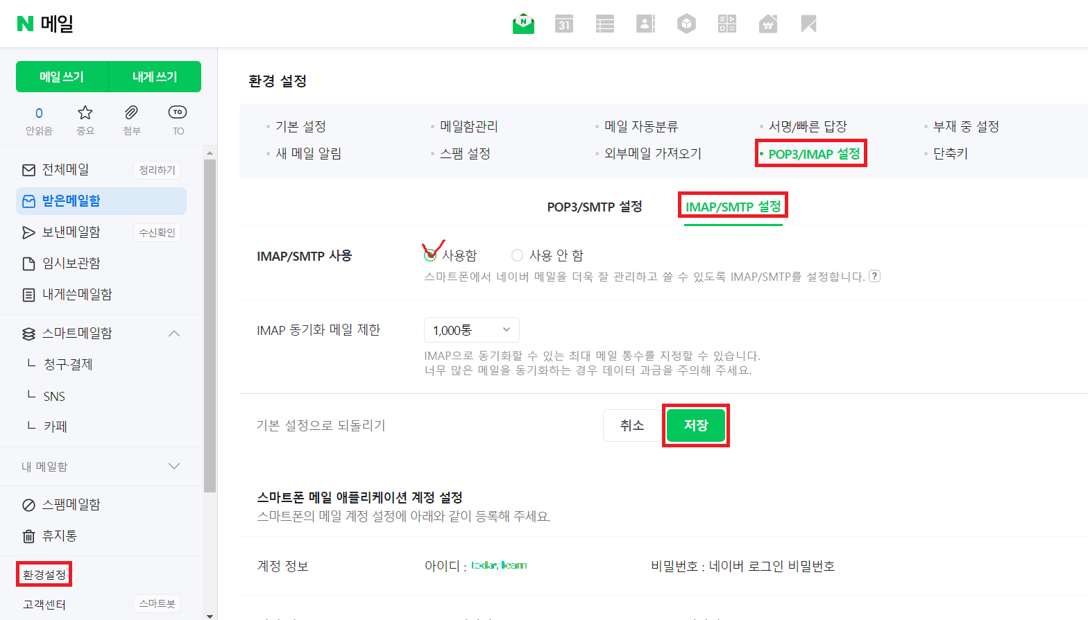 즉, 보내는 사람의 이메일 계정에서 별도의 설정이 필요하므로, 네이버 메일로 들어가서 [환경설정] > [POP3/IMAP 설정] > [IMAP/SMTP 설정] 클릭한 후 '사용함'을 체크한 후 저장 버튼을 클릭한다.