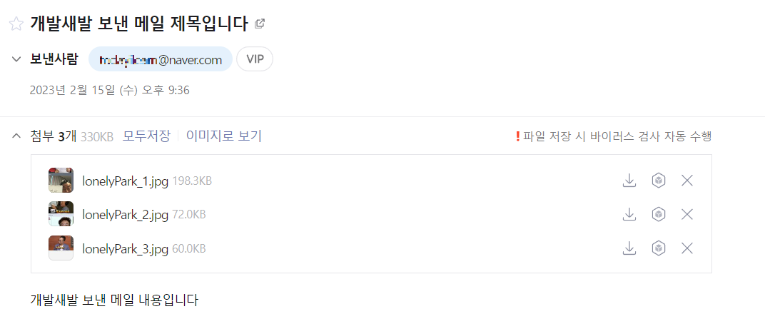 위 소스를 실행 결과한 결과이다. 제목과 내용 말고도, 샘플 이미지 3개가 첨부파일에 보이고 있다.