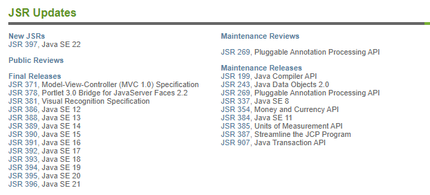 Java SE는 JCP(Java Community Process)라는 조직을 통해서 만들어지는데, JCP 홈페이지에서 JSR 배포 목록을 확인할 수 있다. 이때 JSR(Java Specification Request)은 JCP 조직을 통해 Java 플랫폼의 최종 사양을 말한다.