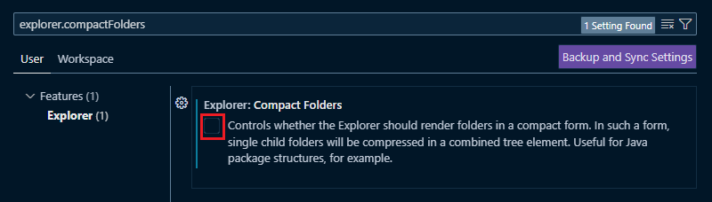 설정창에서 explorer.compactFolders 검색 후 Explorer: Compact Folders 체크박스를 해제한다.
