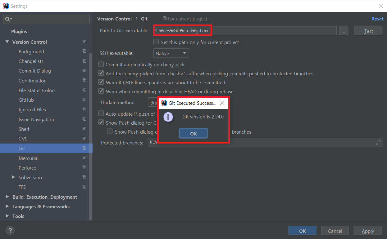 Path to Git executable가 변경된 것을 확인한 후 [Test]를 누르면 Success 창이 뜨면 Git 테스트가 성공한 것이다.