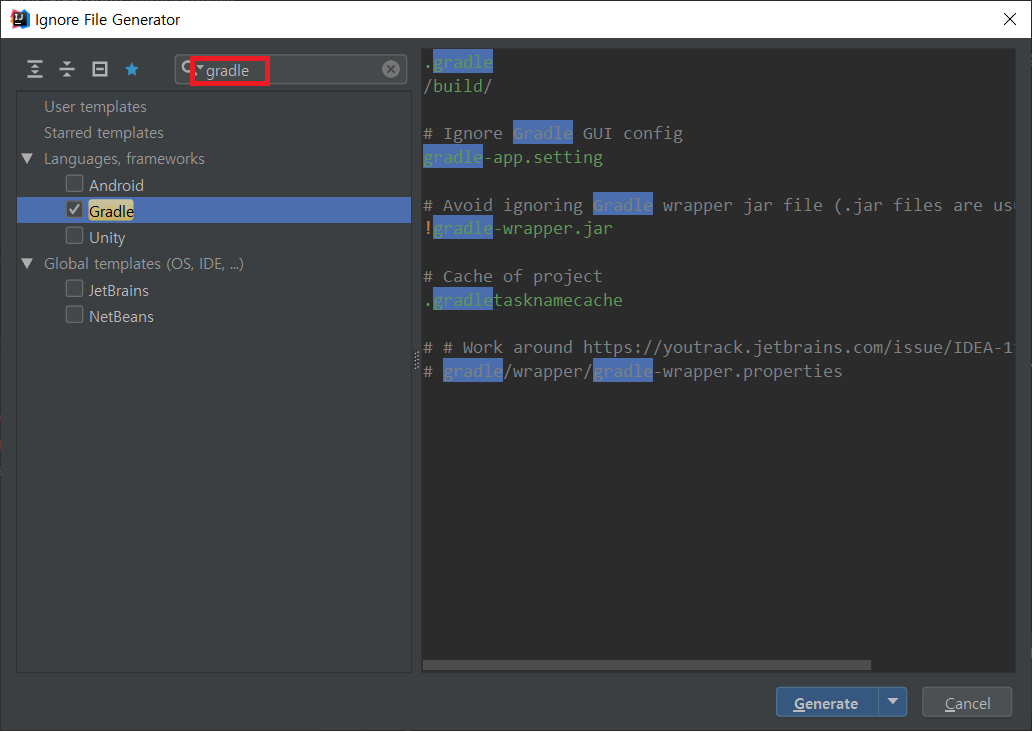 IntelliJ에서 [File] - [New] - [.ignore file] - [.gitignore file (Git)] 클릭한 후 'Gradle'을 검색하여 추가한다.