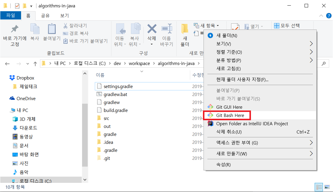 Intellij에서 프로젝트를 Git과 연동하기 전에, 먼저 Git에서 사용자 계정을 등록해야 한다. 아래와 같이 프로젝트 workspace에서 마우스 우클릭을 한 뒤 'Git Bash Here'을 클릭하면 Git Bash 창이 열린다.