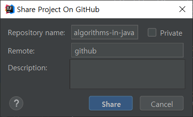 IntelliJ에서 [VCS] - [Import into Version Control] - [Share Project on Github]를 누른다. 그리고 Github에 올라갈 Repository 이름을 정한다.