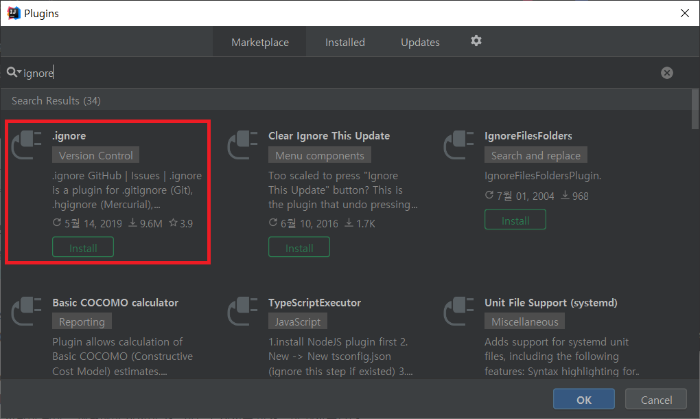 Plugins 창이 뜨고 여기서 ignore를 검색하여 설치한다.