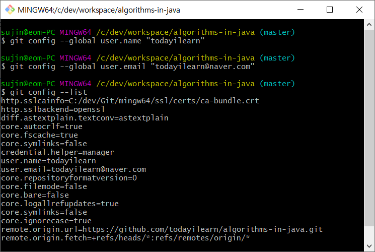 Git Bash 창에서 아래의 명령어를 순서대로 입력하여 사용자 계정 등록을 한다.