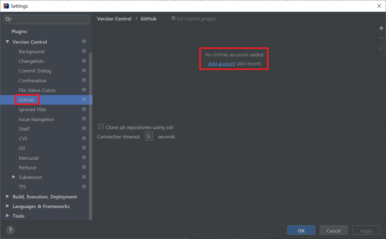 이제 [GitHub] 화면으로 이동해서 'Add account'를 눌러 GitHub의 계정을 추가한다. 자신의 GitHub Id와 Password를 입력하고 Test 하여 결과를 확인하자.