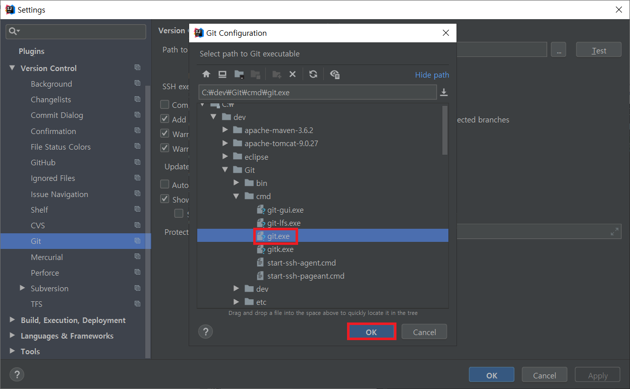 Git을 기본 설정 그대로 설치했다면 git.exe 실행 파일은 C:\Program Files\Git\cmd에 위치한다. 나는 C:\dev\Git\cmd에 위치한다.
