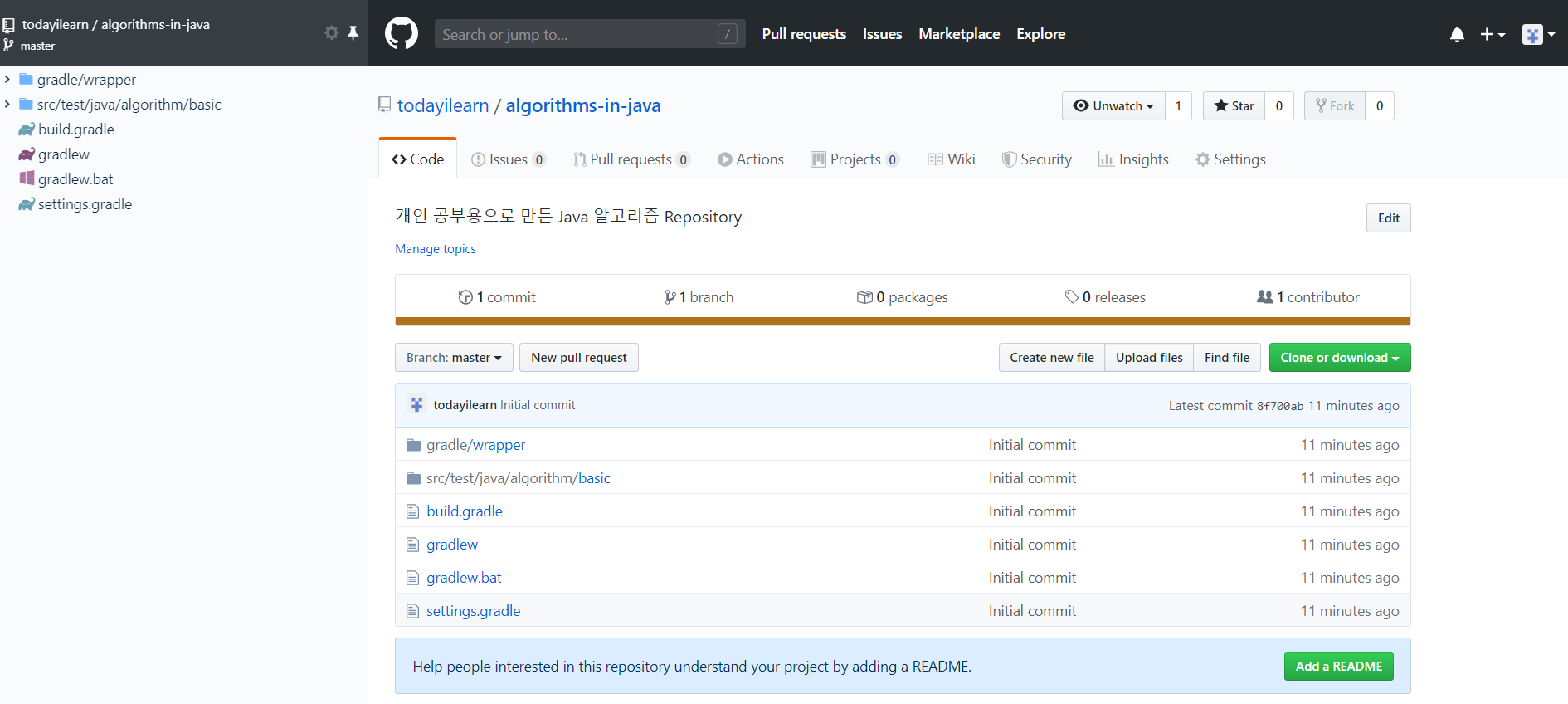 이제 모든 과정이 끝났다. IntelliJ에서는 'Successfully shared project on GitHub:'라는 성공 메시지가 뜰 것이다. 프로젝트가 제대로 Push 되었는지 Github에서 확인해보자.