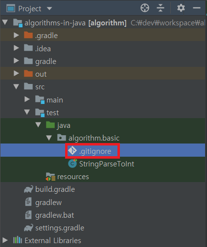 그러면 IntelliJ에서 Gradle용 .gitignore 파일이 생성된 것을 확인할 수 있다.