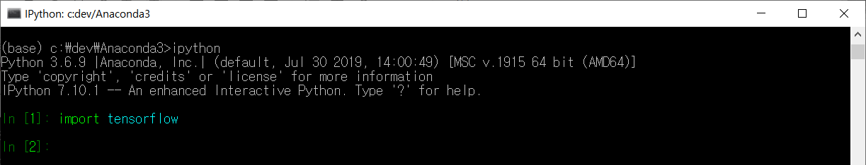 아나콘다에서 텐서플로를 설치한 후, 제대로 설치되었는지 확인하기 위해 아래의 단계를 실행하였다.
