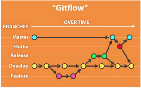 Gitflow는 Git branch의 관리전략 중 하나이다. 아래 사진이 Gitflow의 예시인데, 효율적으로 소스를 관리하기 위해 목적에 맞는 브랜치로 쪼갠 모습이다.