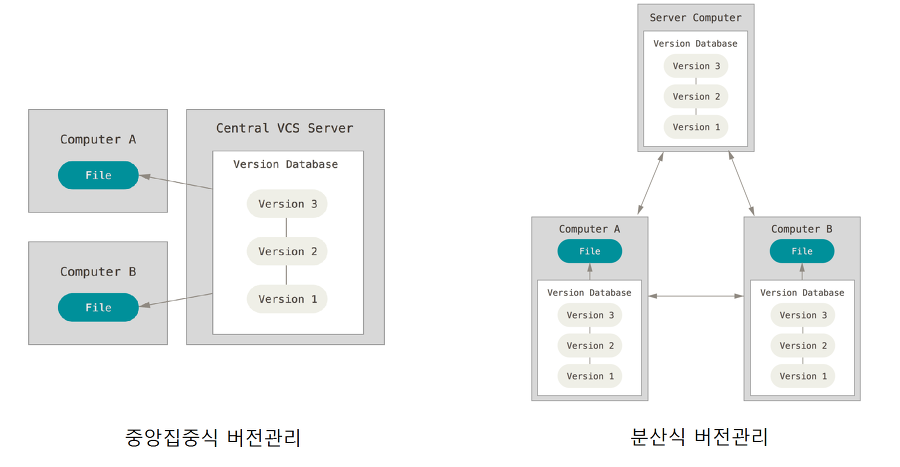 버전 관리 시스템은 크게 2가지 방식이 있다. 과거에는 중앙집중식 위주로 버전을 관리하다가, 요새는 분산식으로 많이 이용하는 추세이다. 분산식 버전관리의 대표적인 예가 바로 Git 이다.