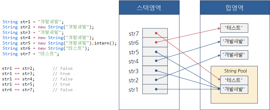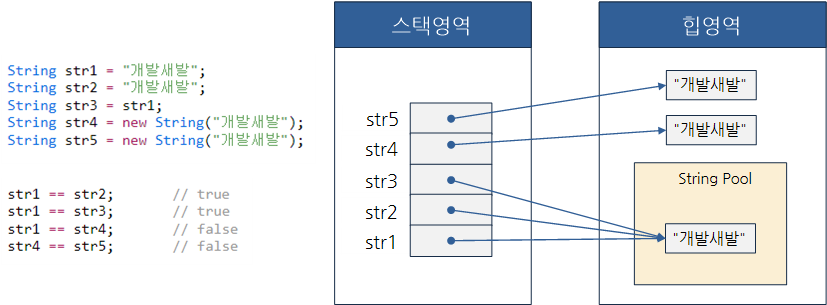 String str2 = new String("개발새발"); // new 연산자로 문자열 생성 (String Object)