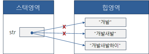 모든 변수들은 "개발새발"이라는 동일한 문자열을 만들고 있지만, 실제로 힙 메모리에 저장되는 공간은 다르다.