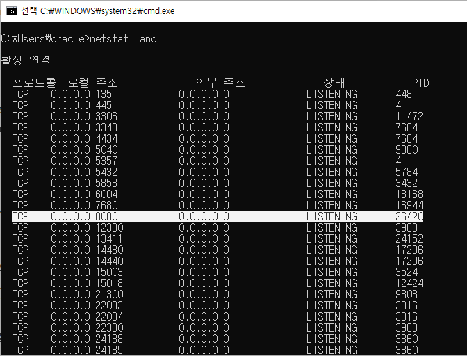 아래와 같이 26420이라는 PID(프로세스 아이디)의 프로세스가 8080 포트를 사용 중인 것을 볼 수 있다.