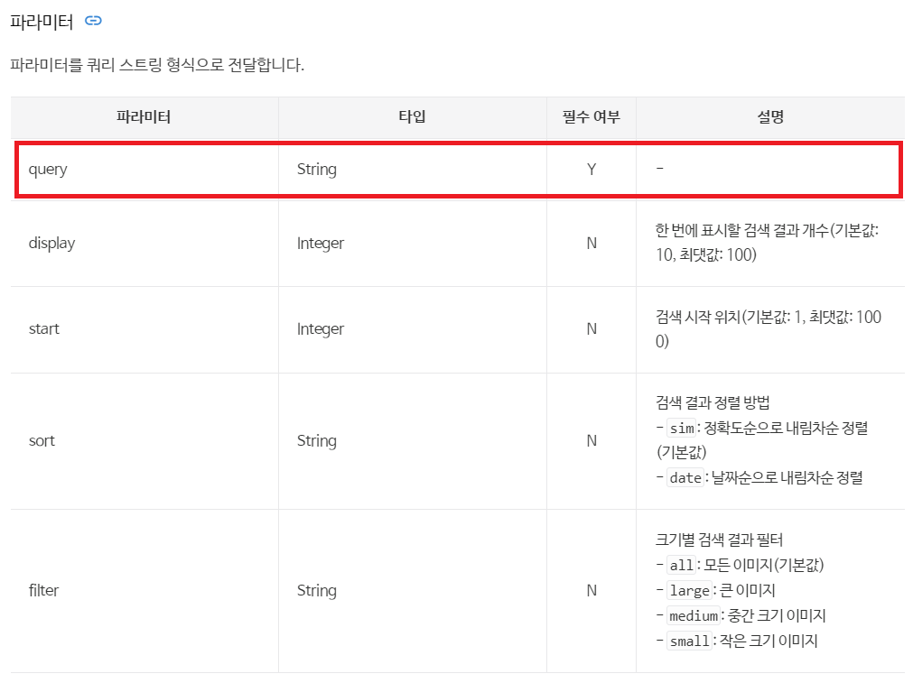 이번에는 네이버에서 제공된 이미지 검색 OpenAPI을 사용하여 이미지가 있는 URL을 출력해보자. 이미지 검색요청시(request), query 파라미터를 필수로 보내야 한다. 카카오와 동일한 파라미터명이므로 query 파라미터에 '고독한 박명수'로 설정할 것이다.