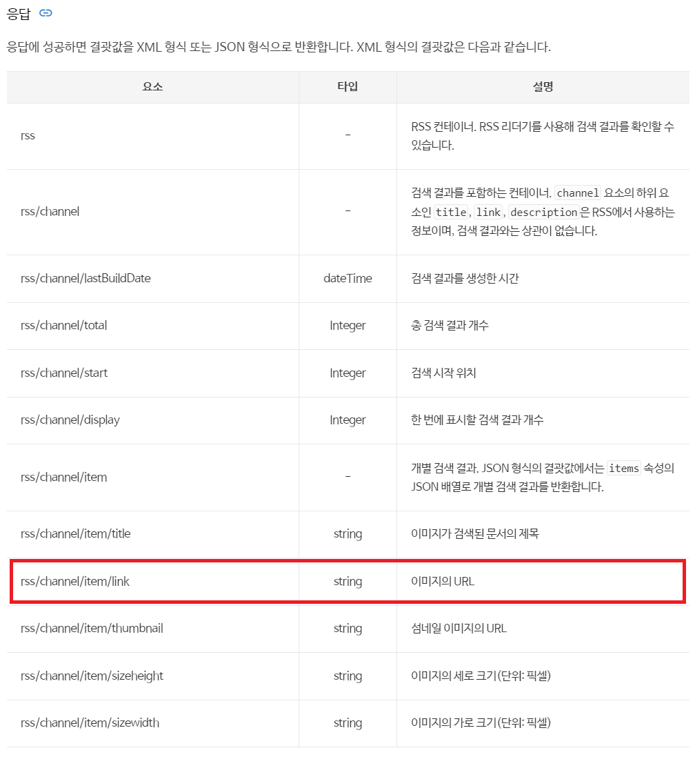 이미지 검색 응답시(response), 응답 데이터 중에서 item > link 항목이 추출하고자 하는 이미지 URL이다. 즉, link 항목이 추출할 목표 대상이다.