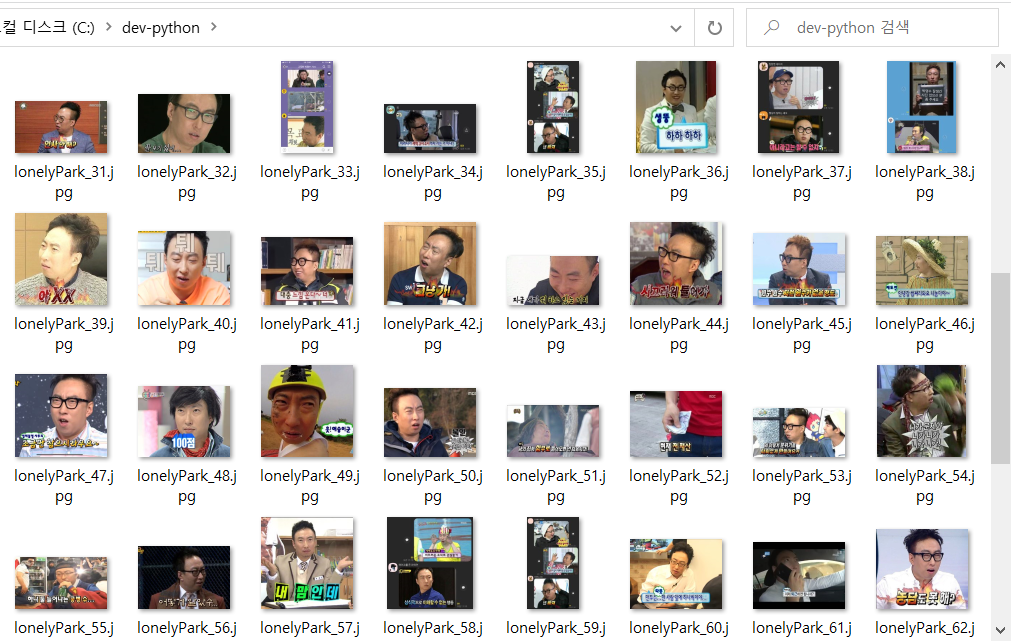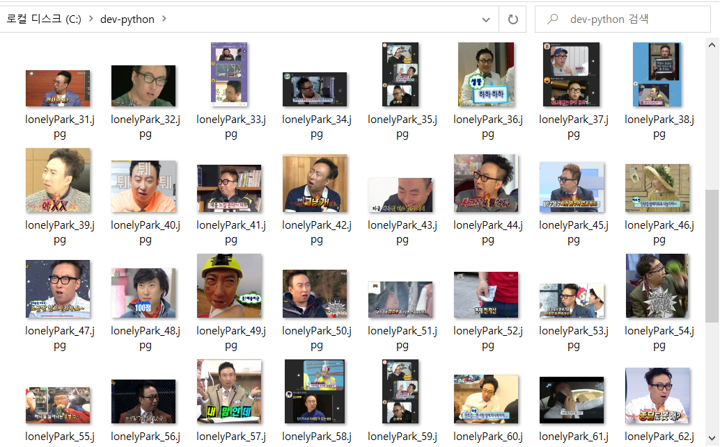 주피터 노트북에서 실행해 보면, 아래처럼 '고독한 박명수' 짤이 수집되는 것을 알 수 있다. 간단하게 파이썬과 주피터 노트북을 이용하여, 카카오와 네이버 OpenAPI로 고독한 박명수 짤을 수집해 보았다.