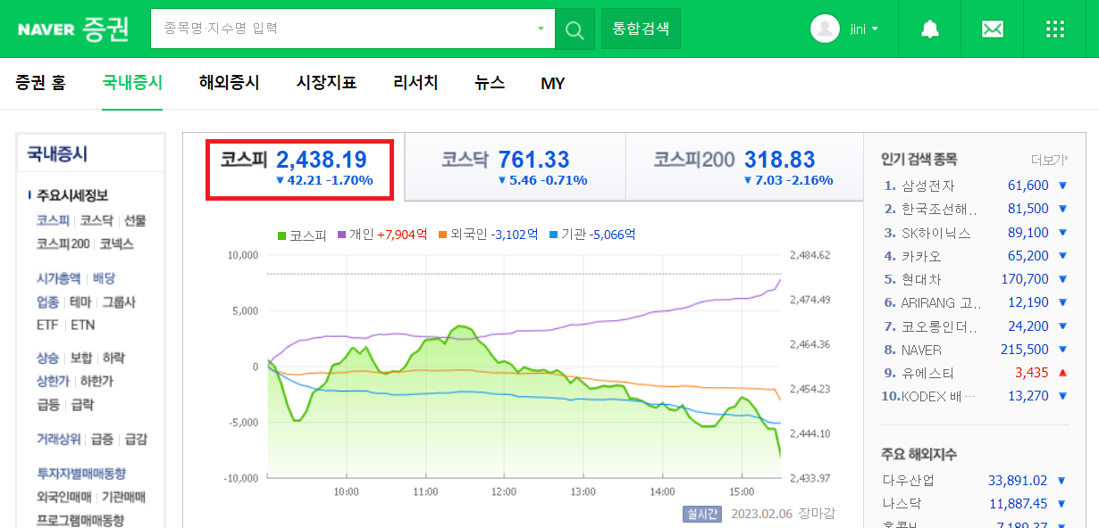 네이버 증권 사이트에서 코스피 일별 체결가를 수집해 볼 것이다. 아래처럼 네이버에서 증권 > 코스피 메뉴로 들어간다.