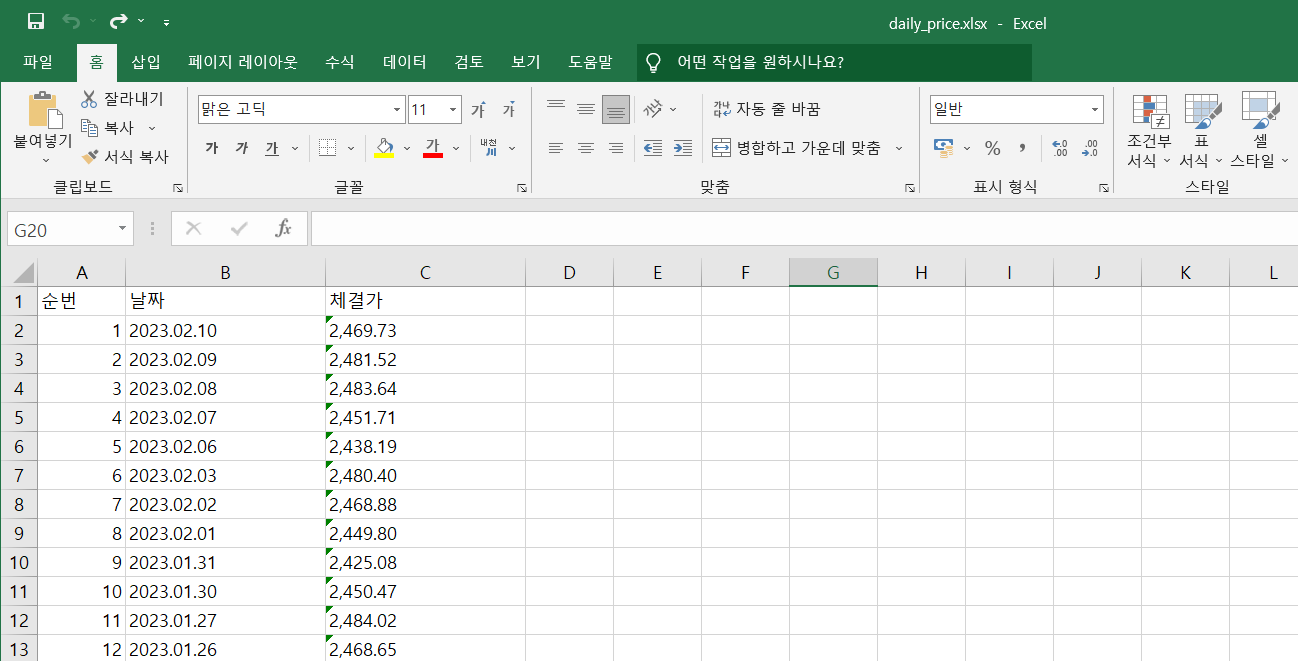 일별시세의 첫 번째 페이지의 정보와 마지막페이지 번호 값을 가져와봤다. 이제 이 부분을 함수로 만들어서, 마지막페이지 수만큼 요청하여 딕셔너리에 담아보고, 추출한 결괏값을 엑셀로 추출해 봤다.